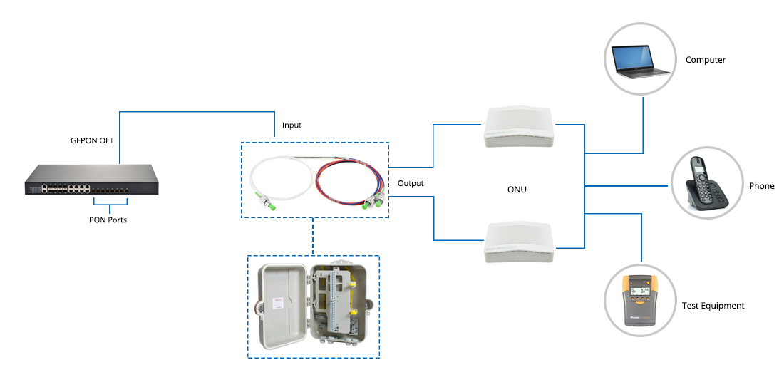 As one of the key components for GPON FTTx networks, optical splitters can be placed in the Central Office or in one of the distribution points (outdoor or indoor). Because the FBT splitters are highly stable for multiport optical signal splitting with low insertion loss, they are designed for power splitting and tapping in telecommunication equipment, CATV network, and test equipment.