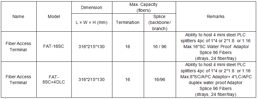 The fiber access termination hub is able to hold up to 16 subscribers and 96splicing points as terminal. It is used as a splicing closure and a termination point for the feeder cable to connect with drop cable in FTTX network system. It integrates fiber splicing, splitting, distribution, storage and cable connection in one solid protection box.